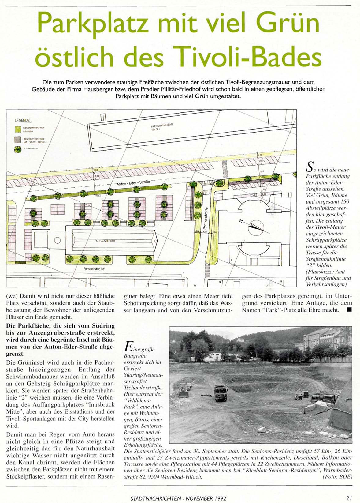 Die Spatenstichfeier fand am 30. September statt. Die Senioren-Residenz umfaßt 57 Ein-, 26 Eineinhalb- und 27 Zweizimmer-Appartements jeweils mit Küchenzeile, Duschbad, Balkon oder