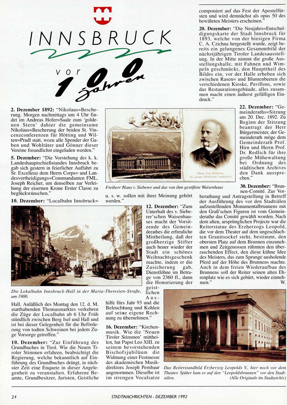 2. Dezember 1892: "Nikolaus=Bescherung. Morgen nachmittags um 4 Uhr findet im Andreas Hofer=Saale zum "goldenen Stern" dahier die gemeinsame