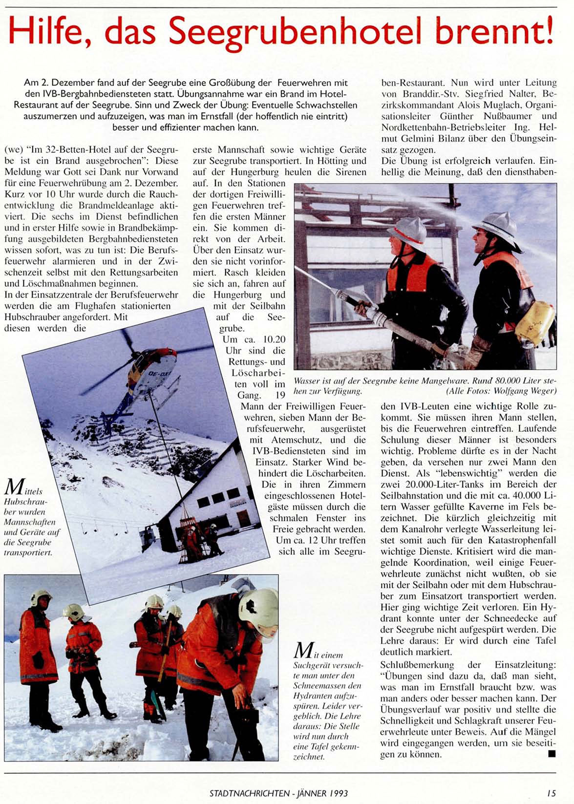 den IVB-Bergbahnbediensteten statt. Übungsannahme war ein Brand im H o t e l Restaurant auf der Seegrube. Sinn und Zweck der Übung: Eventuelle Schwachstellen