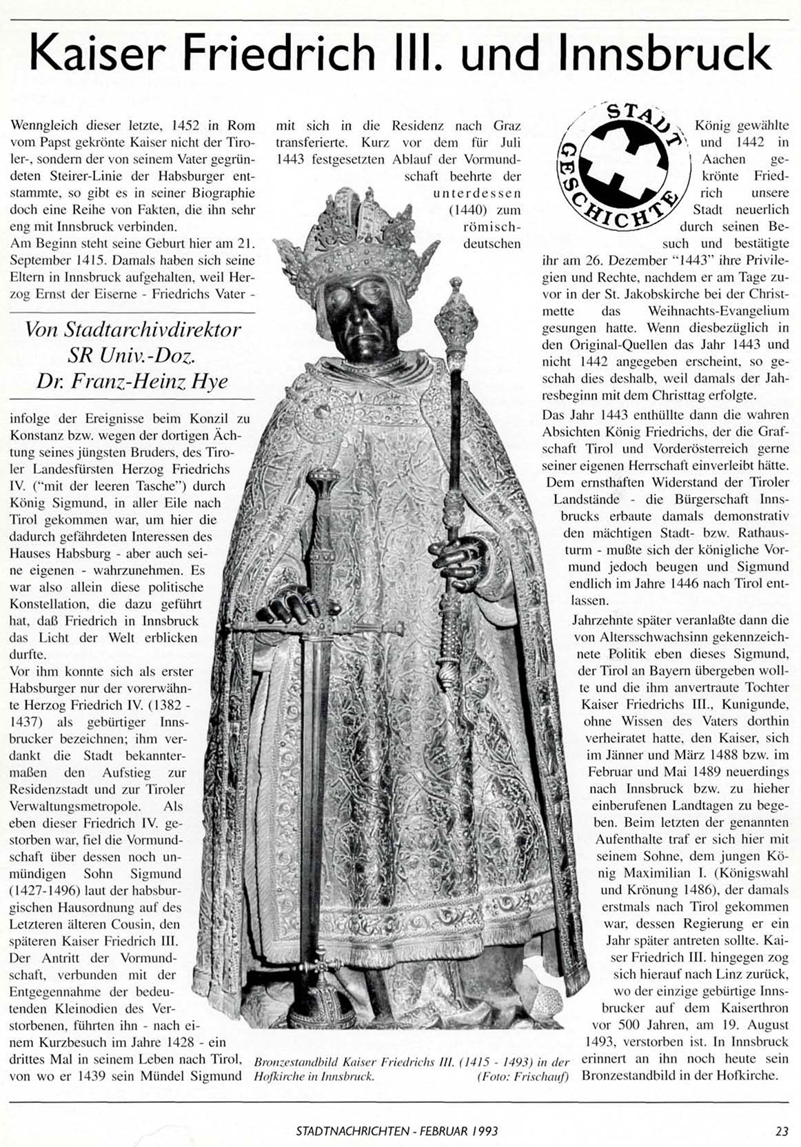 vom Papst gekrönte Kaiser nicht der Tiroler-, sondern der von seinem Vater gegründeten Steirer-Linie der Habsburger entstammte, so gibt es in seiner Biographie