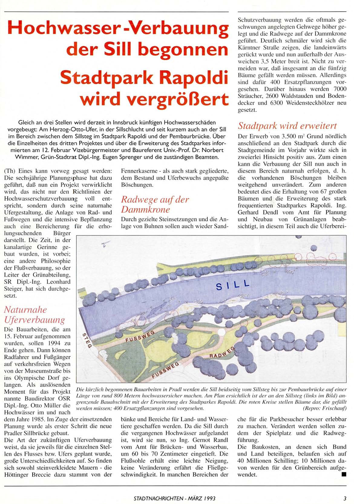 Länge von rund 800 Metern hochwassersicher machen. Am Plan ersichtlich ist der an den Sillsteg (links im Bild) annannte Baudirektor OSR grenzende Bauabschnitt mit der Erweiterung des Stadtparkes Rapoldi. Die roten Kreise stellen Bäume dar, die gefällt