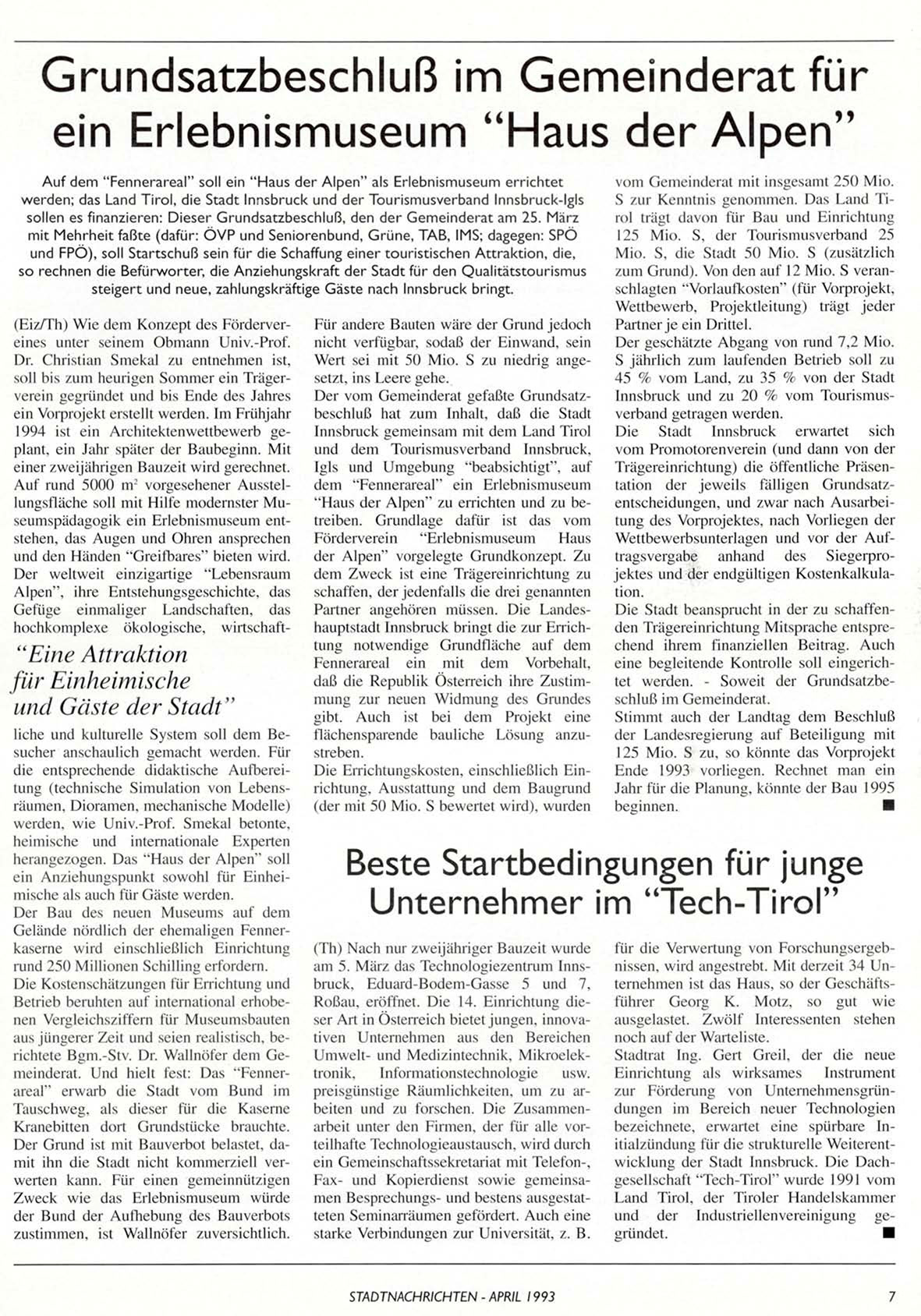 bezeichnete, erwartet eine spürbare Initialzündung für die strukturelle Weiterentwicklung der Stadt Innsbruck. Die Dachgesellschaft "Tech-Tirol" wurde 1991 vom