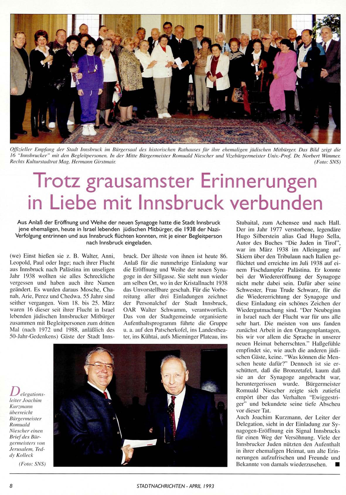 jene ehemaligen, heute in Israel lebenden jüdischen Mitbürger, die 1938 der NaziVerfolgung entrinnen und aus Innsbruck flüchten konnten, mit je einer Begleitperson