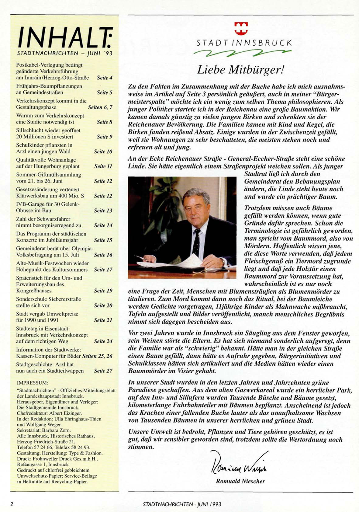Zu den Fakten im Zusammenhang mit der Buche habe ich mich ausnahmsweise im Artikel auf Seite 3 persönlich geäußert, auch in meiner "Bürgermeisterspalte" möchte ich ein wenig zum selben Thema philosophieren. Als