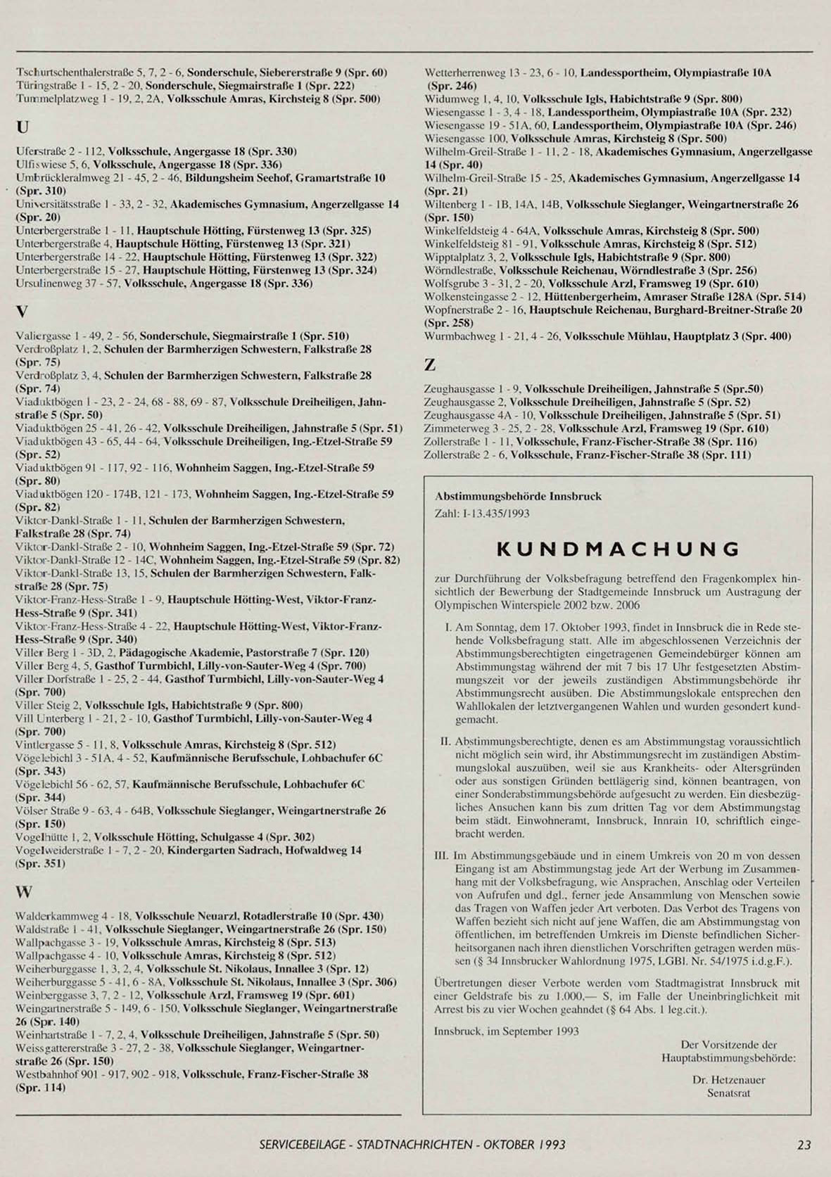 I. Am Sonntag, dem 17. Oktober 1993, findet in Innsbruck die in Rede stehende Volksbefragung statt. Alle im abgeschlossenen Verzeichnis der