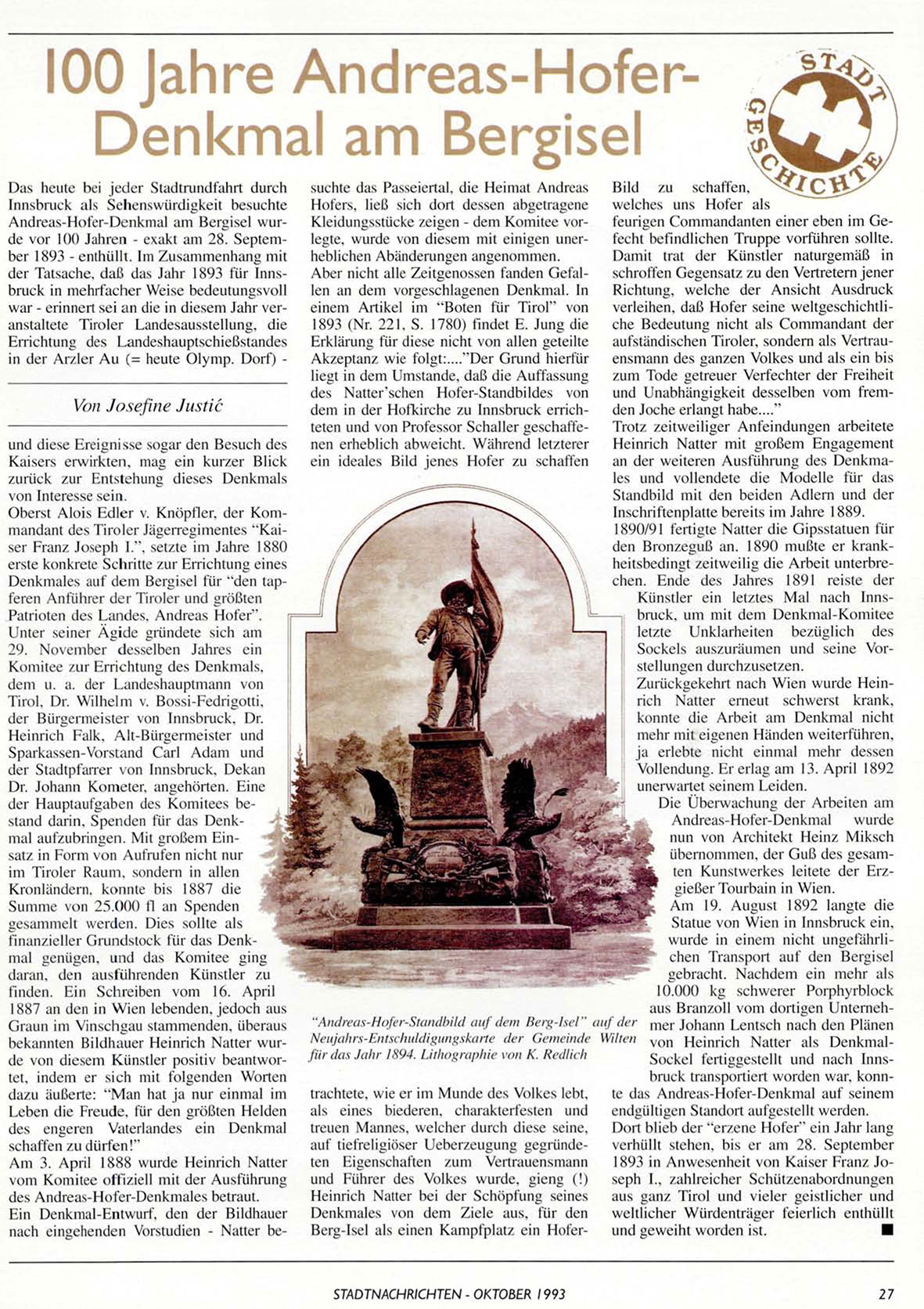 Andreas-Hofer-Denkmal am Bergisel wurde vor 100 Jahren - exakt am 28. September 1893 - enthüllt. Im Zusammenhang mit