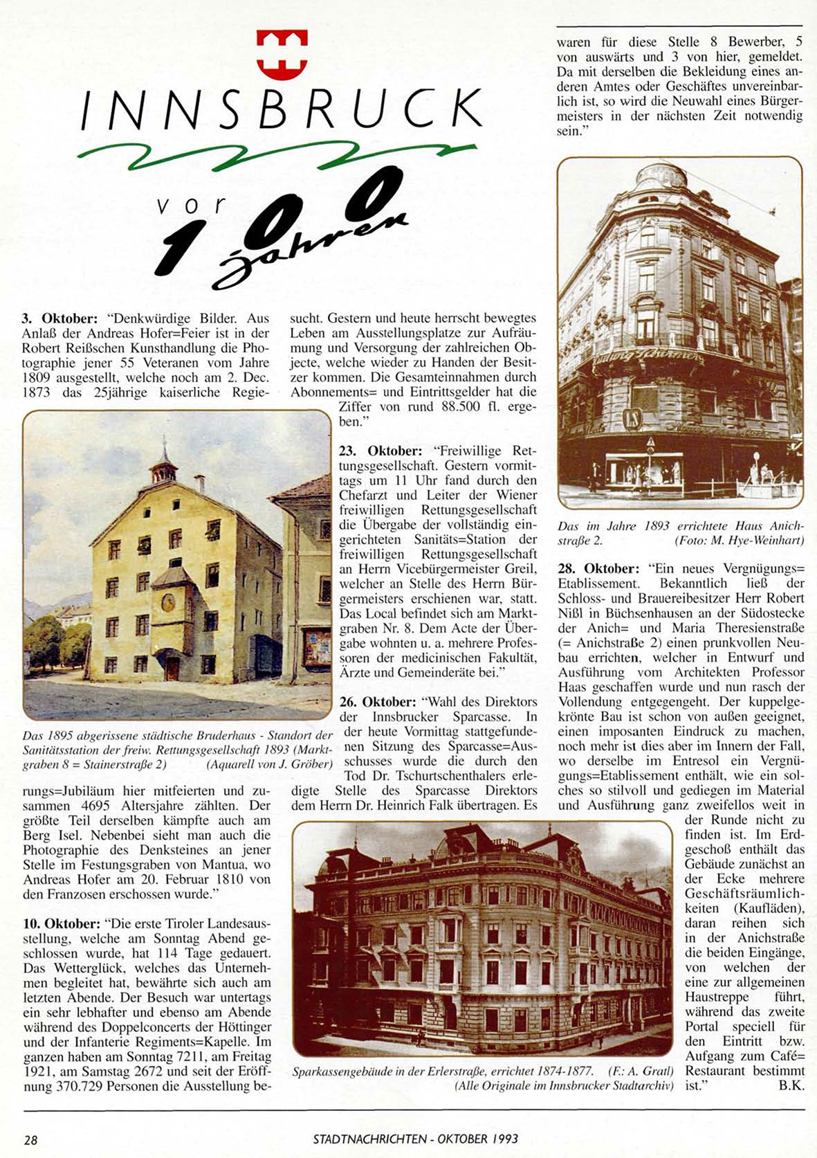 26. Oktober: "Wahl des Direktors Vollendung entgegengeht. Der kuppelgeder Innsbrucker Sparcasse. In krönte Bau ist schon von außen geeignet,