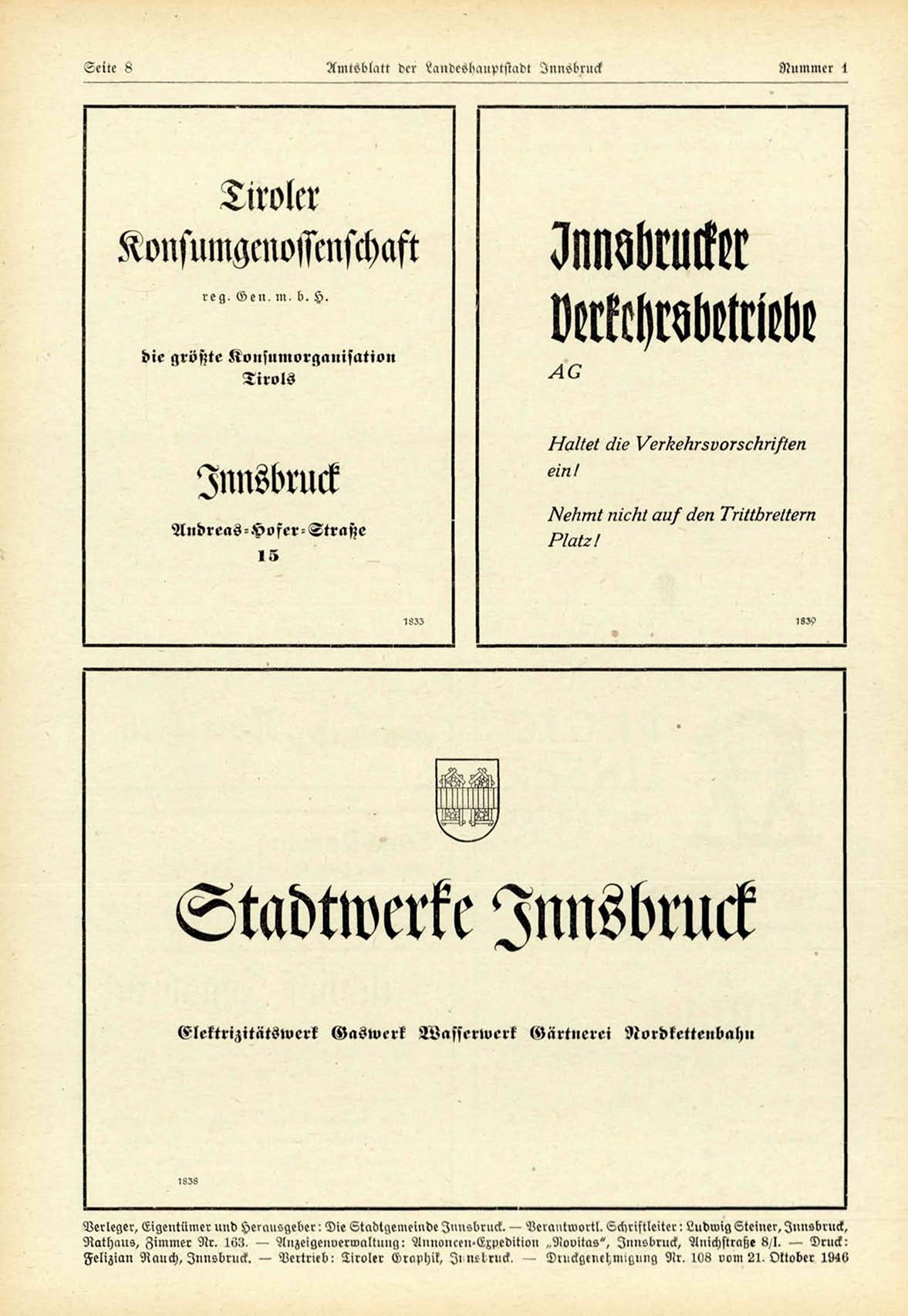 Verleger, Eigentümer und Herausgeber: Die Stadtgemeinde Innsbruck. — Verantwortl. Schriftleiter : Ludwig Steiner, Innsbrucl,
