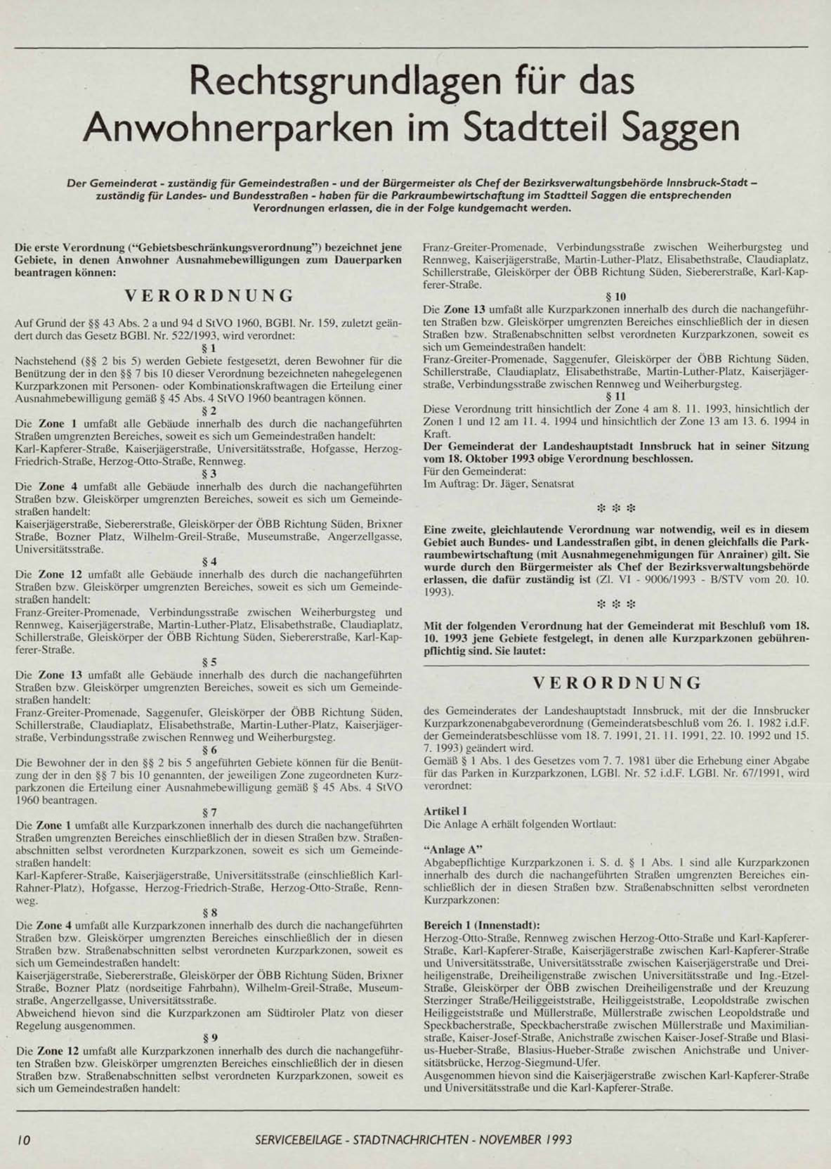 10. 1993 jene Gebiete festgelegt, in denen alle Kurzparkzonen gebührenpflichtig sind. Sie lautet: