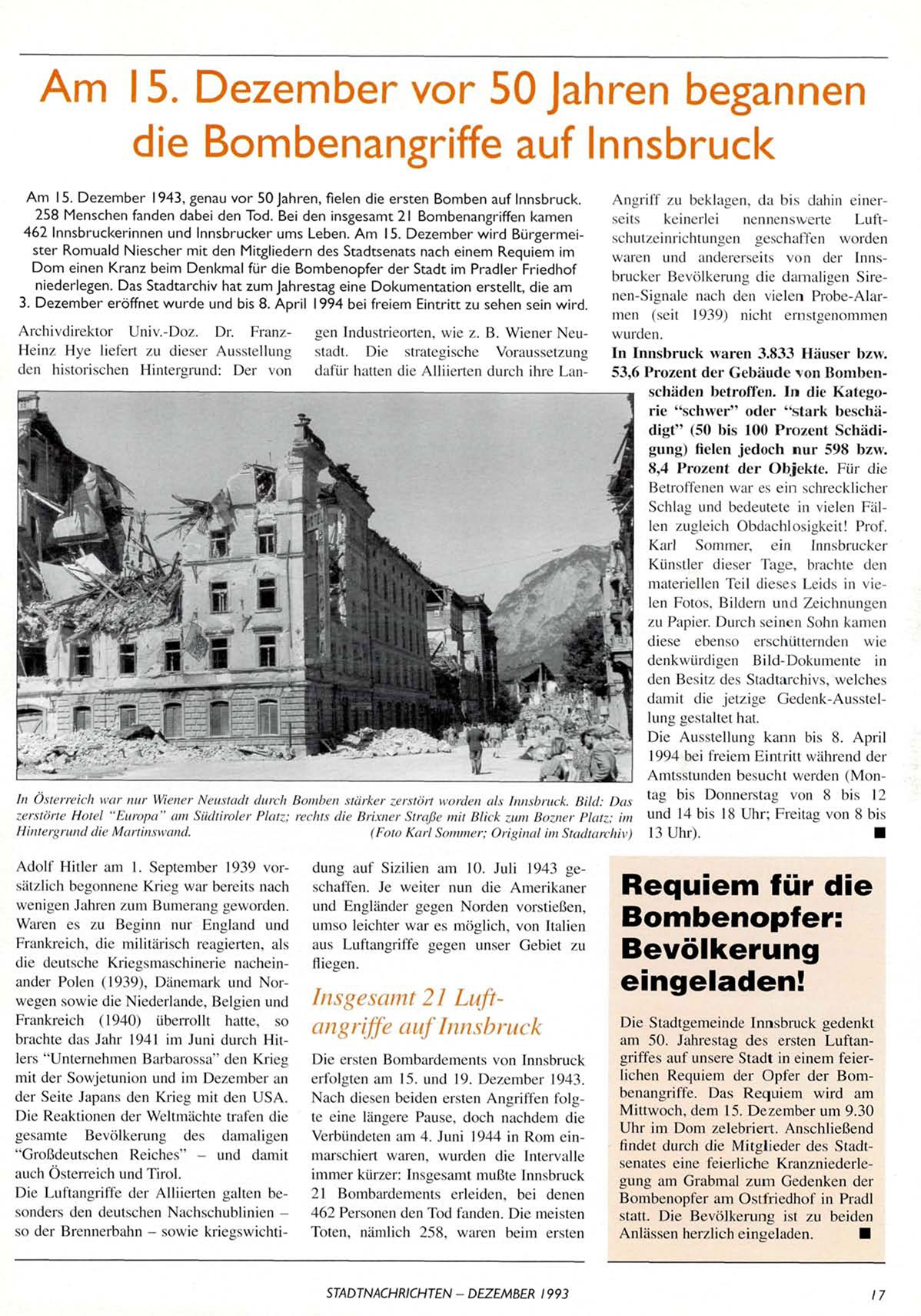 A m 15. Dezember 1943, genau vor 50 Jahren, fielen die ersten Bomben auf Innsbruck.