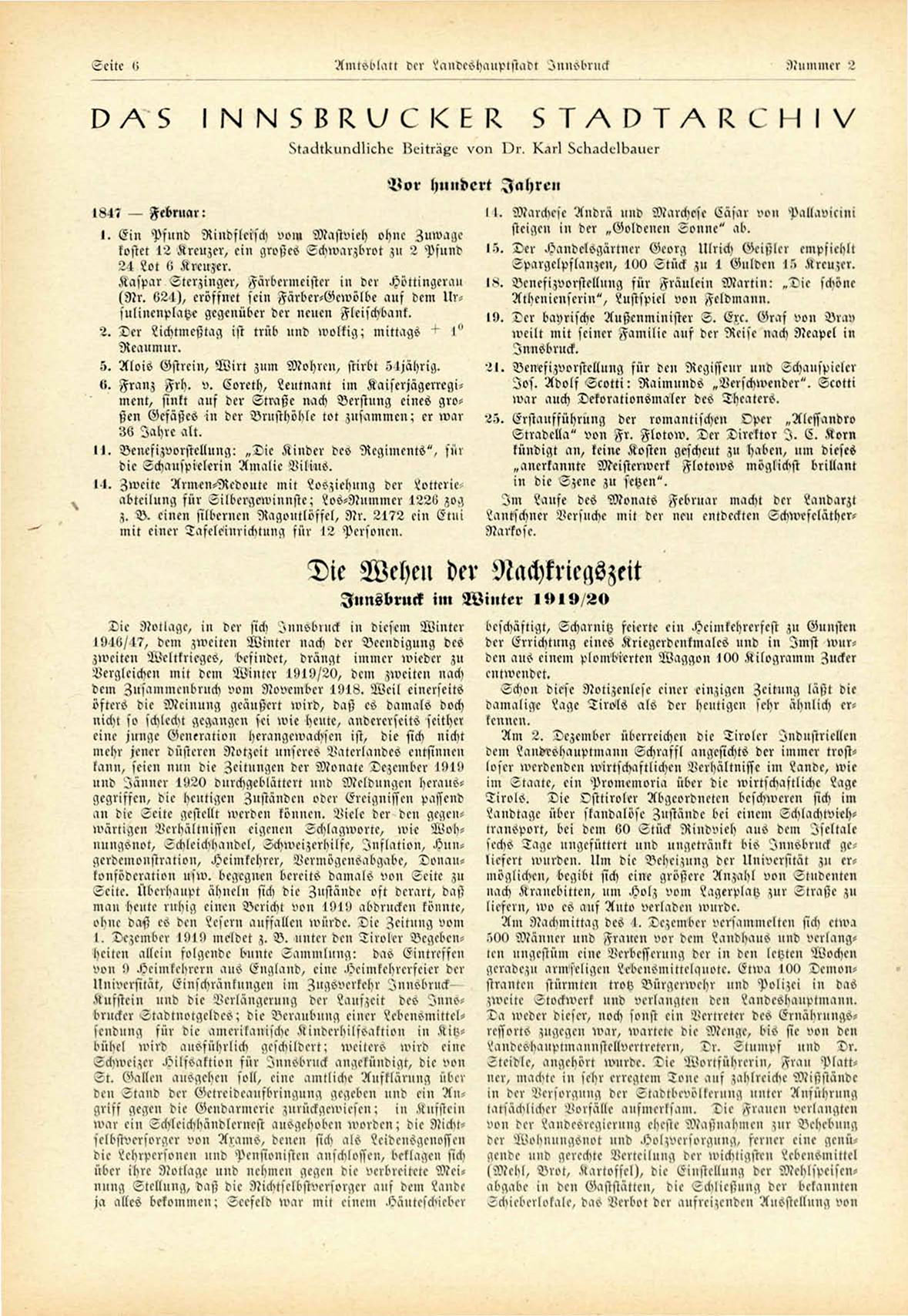 Universität, Einschränkungen im Zugsverkchr InnsbruckKufsteiu und die Verlängerung der Laufzeit deo I n n s brucker Stadtuotgcldes; die Beraubung einer Lebcnsmittclscndung für die amerikanische Kiuderhilfoaltion iu Kitzbühcl wird auoführlick geschildert; weitero wird eine