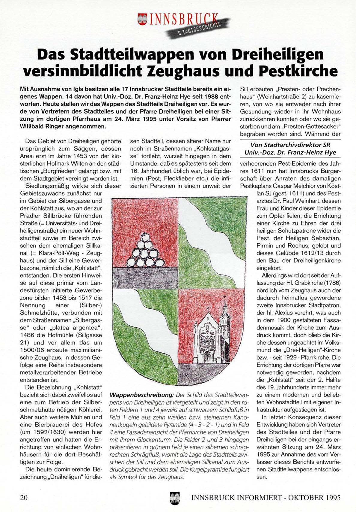 Mit Ausnahme von Igls besitzen alle 17 Innsbrucker Stadtteile bereits ein eigenes Wappen. 14 davon hat Univ.-Doz. Dr. Franz-Heinz Hye seit 1988 entworfen. Heute stellen wir das Wappen des Stadtteils Dreiheiligen vor. Es wurde von Vertretern des Stadtteiles und der Pfarre Dreiheiligen bei einer Sitzung im dortigen Pfarrhaus am 24. März 1995 unter Vorsitz von Pfarrer